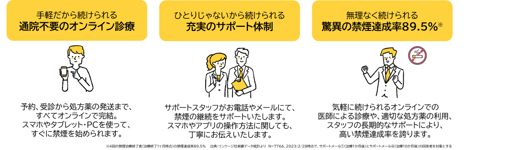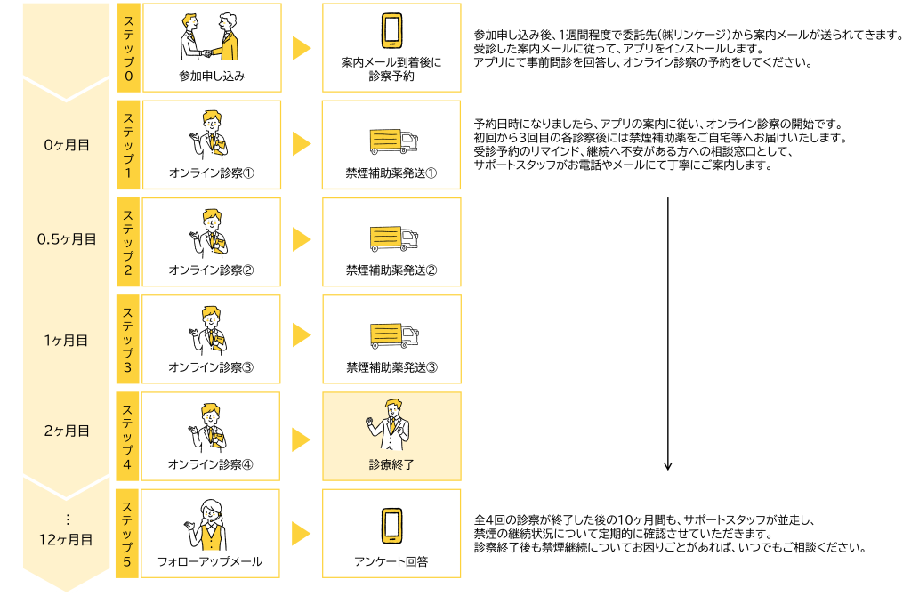 スマートフォン等を使って、都合の良い場所と時間に、医師のオンライン診察が受けられる禁煙プログラムです。