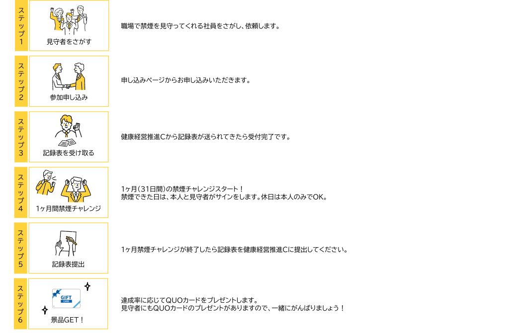 喫煙者が1ヶ月(31日間)禁煙にチャレンジしていただき、見守者にその頑張りを応援していただきます。